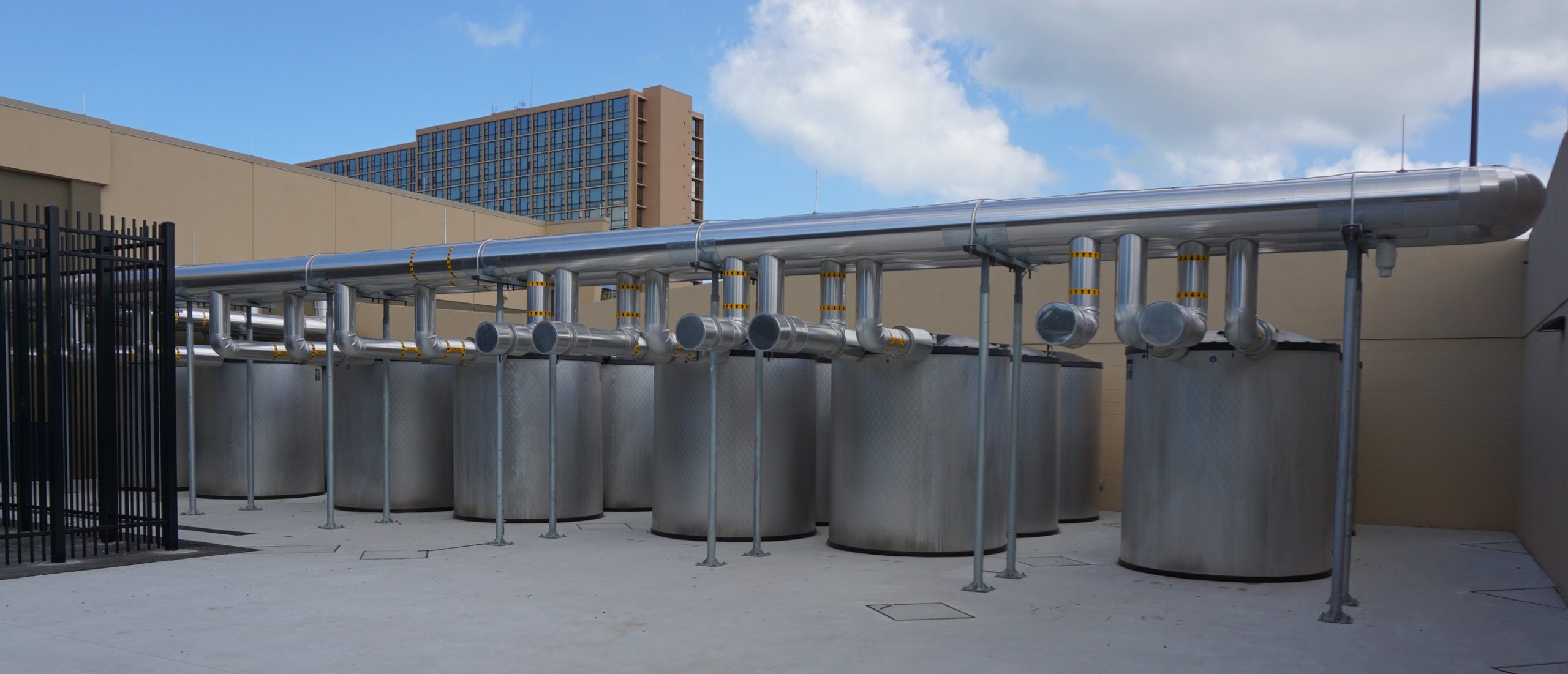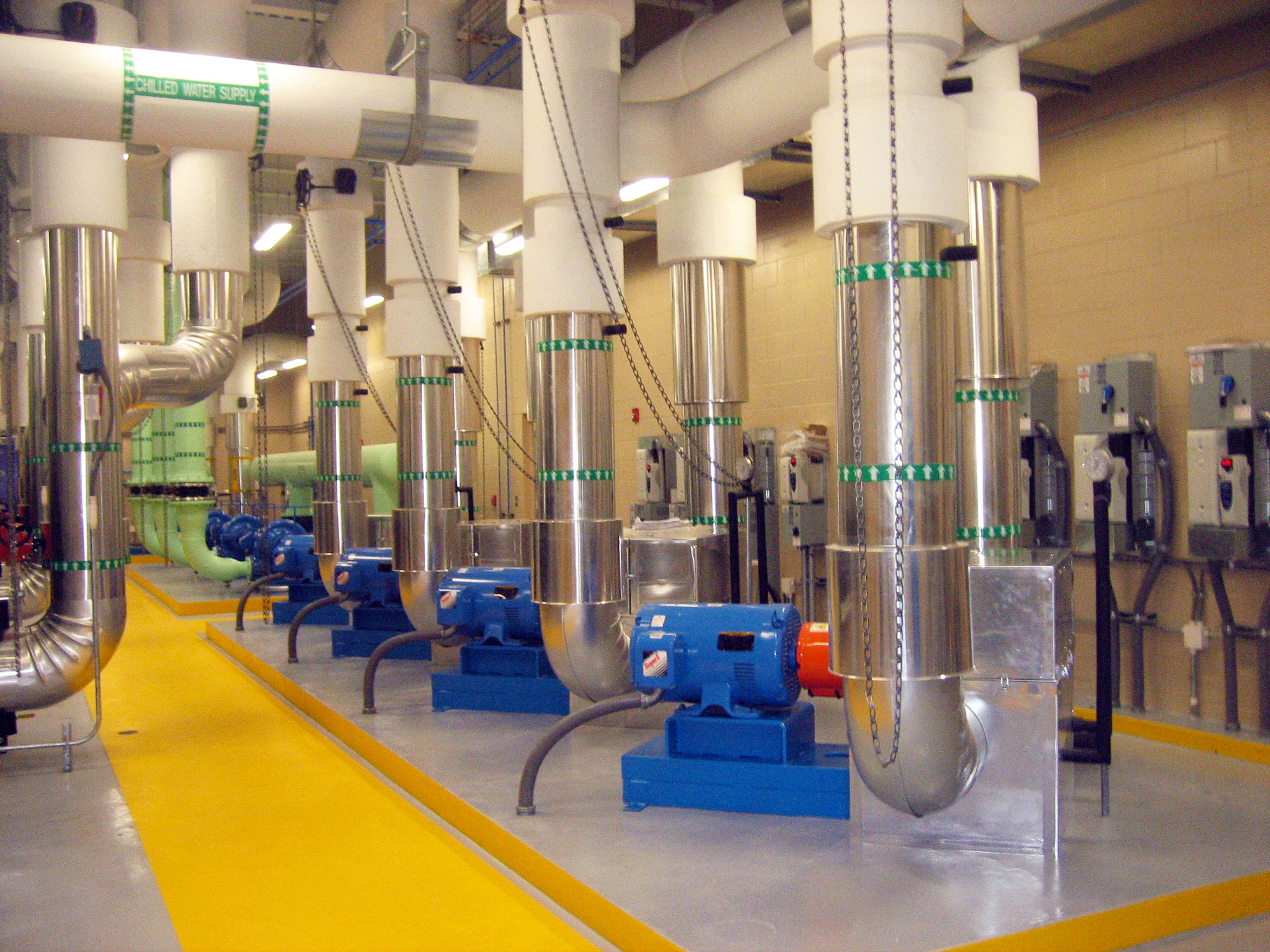 The new District Cooling Plant and the distributed underground piping services seven County buildings in Downtown Clearwater (totaling approximately 500,000 SF). The District Cooling Plant (7,900 SF) initially provides for three, 670-ton, water cooled chillers for a total of 2,010 tons and was designed with the capability to grow to 4,500 tons. One of the three chillers is set up for thermal storage (ice) to take advantage of Power Company rate structures. Three cooling towers are provided along with the future ability to implement geothermal cooling. The thermal storage system is sized for 486 ton-hours. By centralizing the equipment and taking advantage of economy of scale, the County realizes multiple benefits, including energy efficiency and redundancy for more reliable cooling.