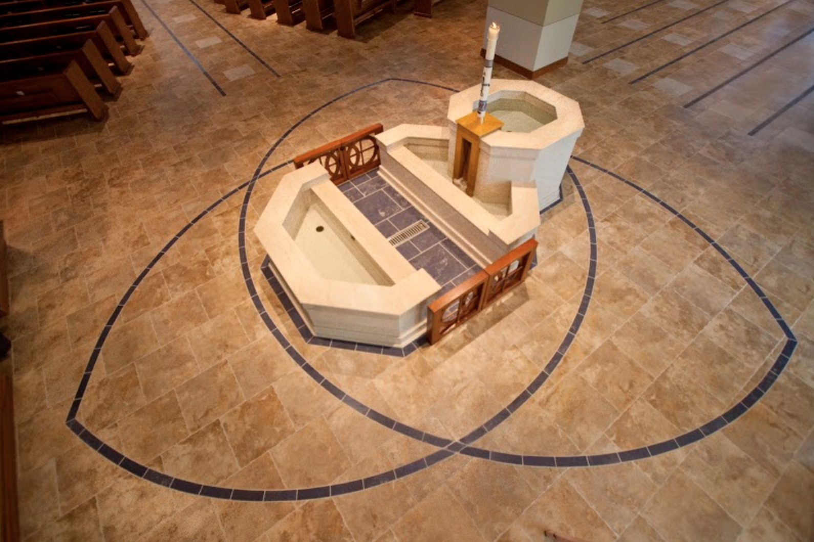 The location of the Font reflects the Christian journey through the waters of Baptism to the Altar. The shape of the Font is octagonal, reminiscent of the Book of Genesis. The Font is designed to allow a passage, a journey, a bridge into and through living waters. It allows for all baptismal candidates regardless of age and/or disability, to enter and rest in the center of the Font. It also allows for a casket to enter and rest in the center during funeral rites.